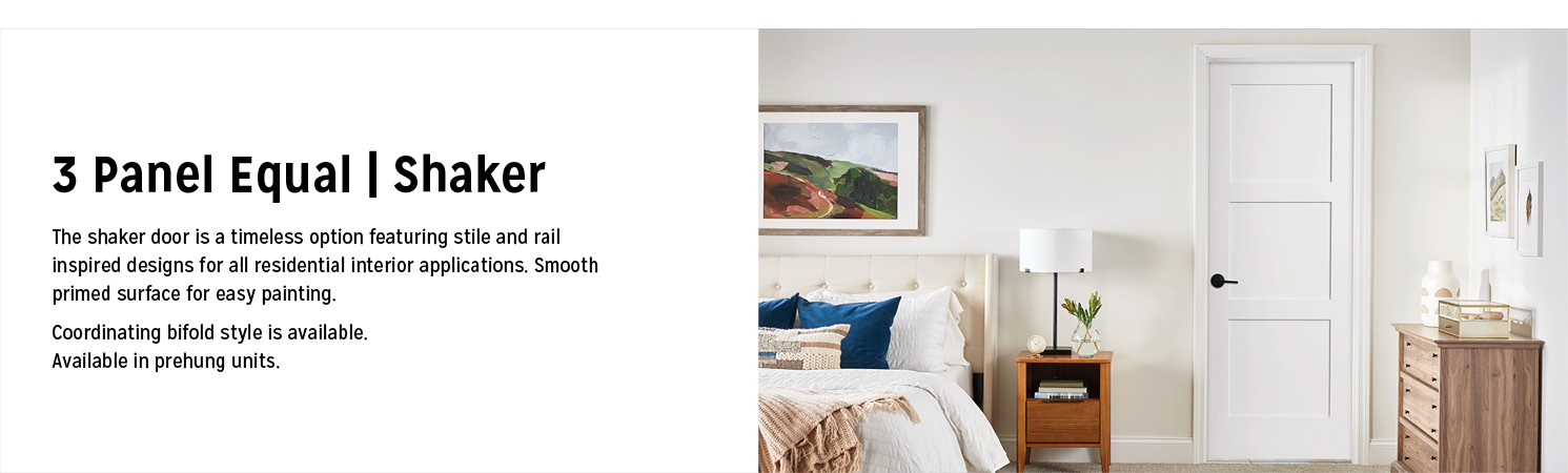 The shaker door is a timeless option featuring stile and rail inspired designs for all residential interior applications. A prehung assembled unit includes an 1-3/8" hollow core door slab, primed pine door frame with 3 ball bearing hinges. Choose between a double rabbetted flat jamb, or a flat jamb with bullnose stop.