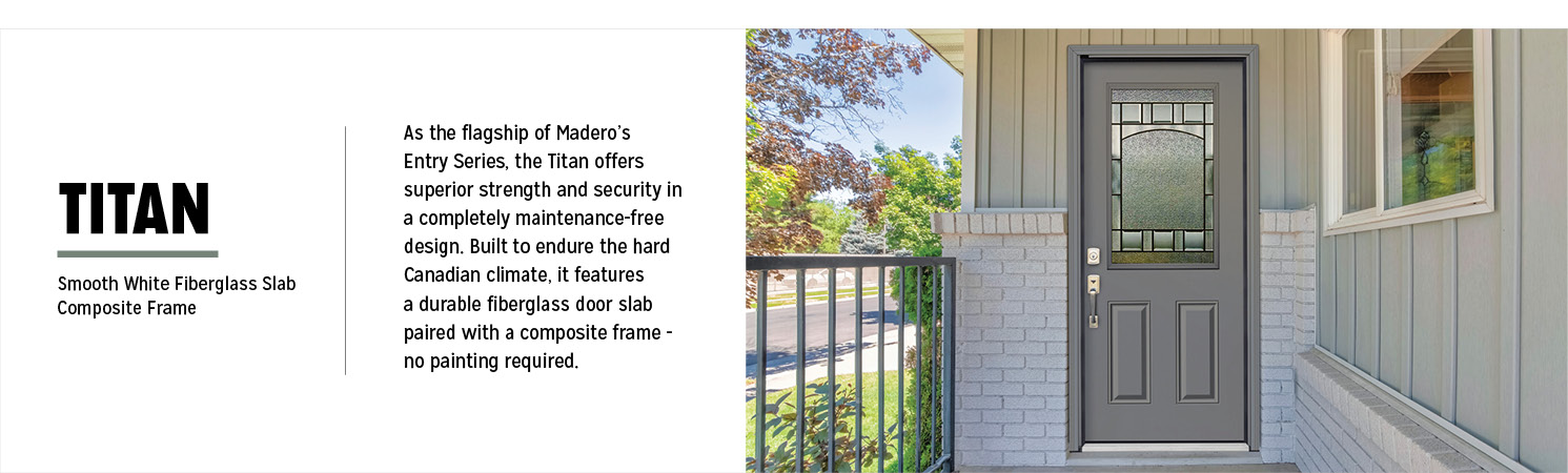 As the flagship of Madero’s Entry Series, the Titan offers superior strength and security in a completely maintenance-free design. Built to endure the hard Canadian climate, it features a durable fiberglass door slab paired with a composite frame -no painting required.
